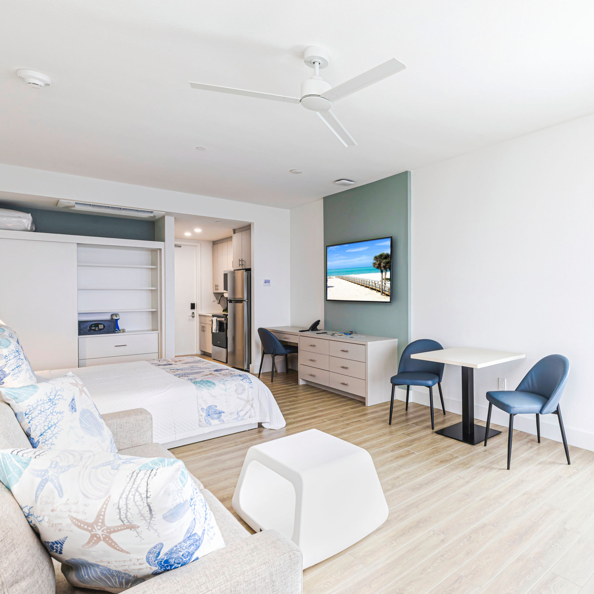 Wake up to the sound of Gulf waves. Every Hotel Studio and Villa at Shalimar Beach Resort includes a water view from your private screened lanai and steps-to-the-sand beach access.
